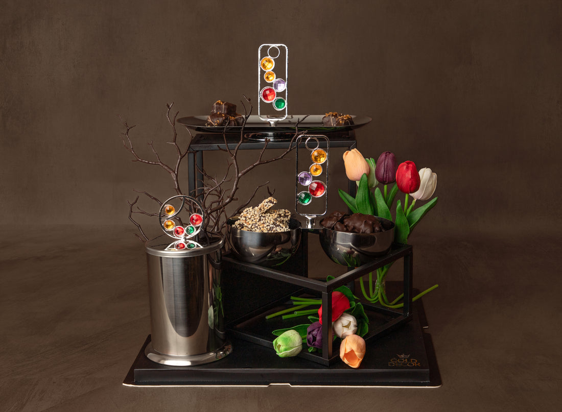 A crystal serving tray designed to elevate any table, styled with glass tubes of layered...