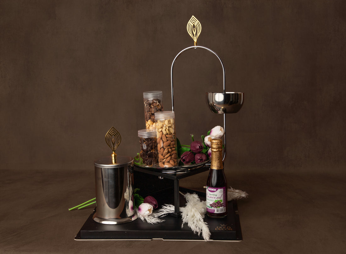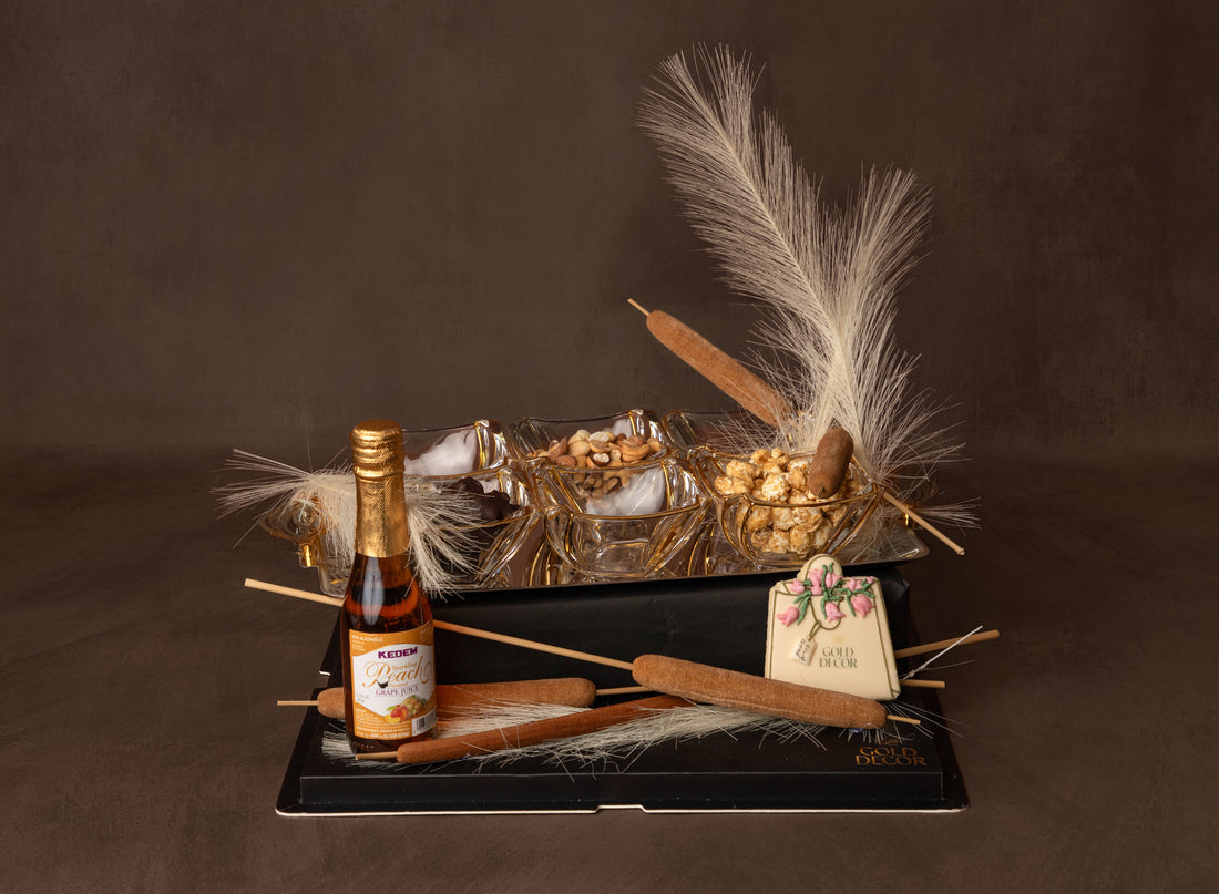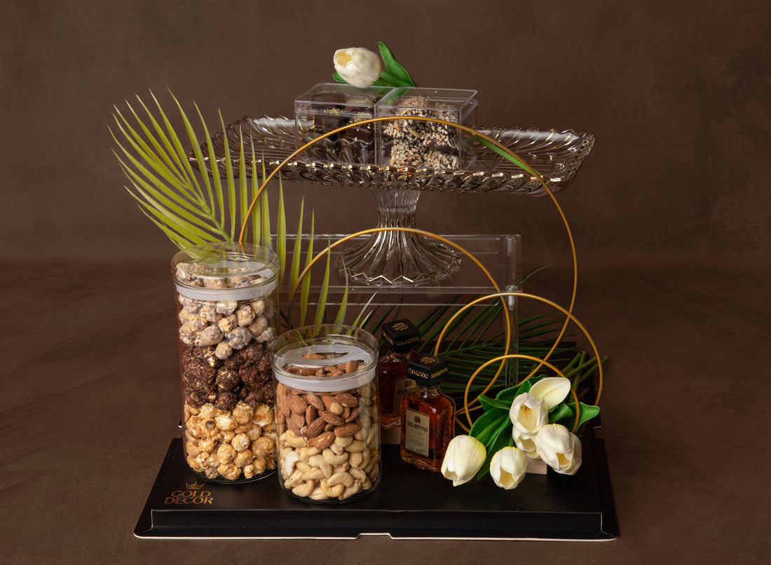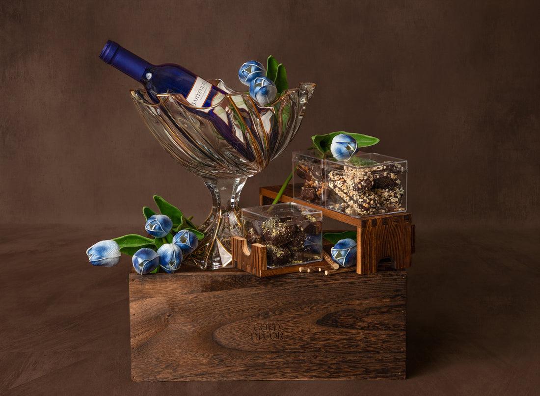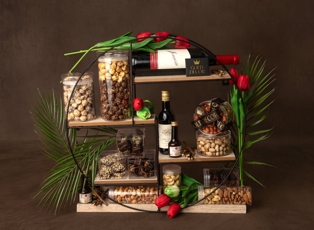 A four-tiered stand showcasing a curated selection of exclusive wines, special whiskies, signature chocolates, artisanal...