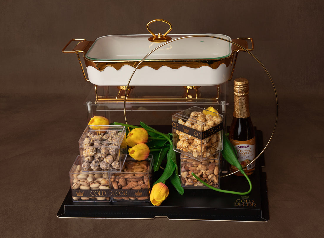 Presenting distinctive metal serving pieces with gold accent detailing, styled with feathers and tubes of...