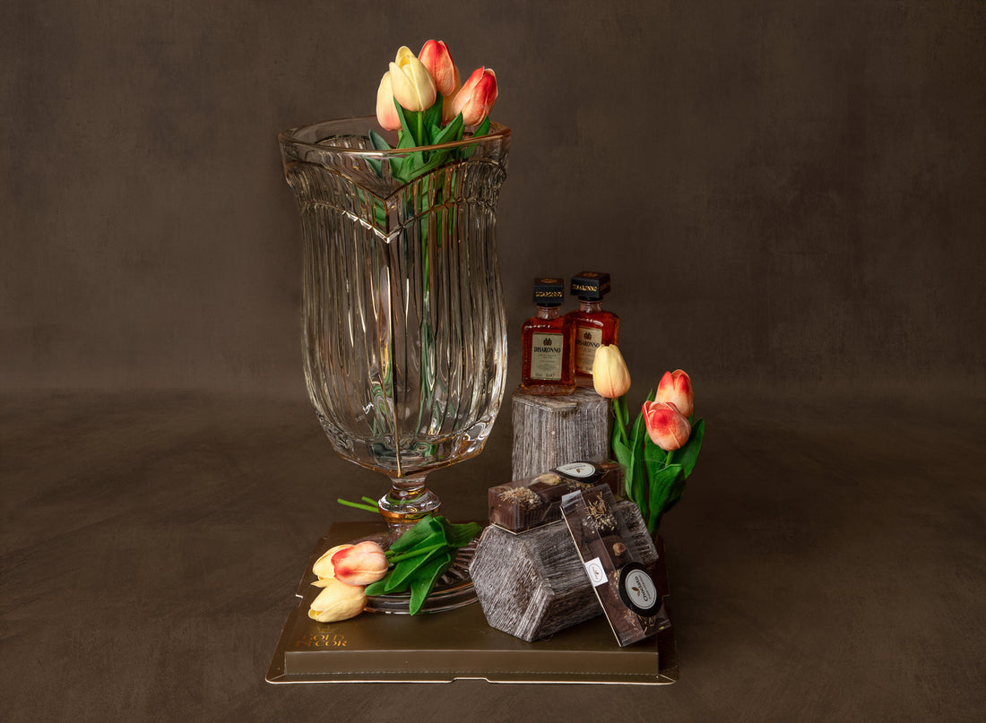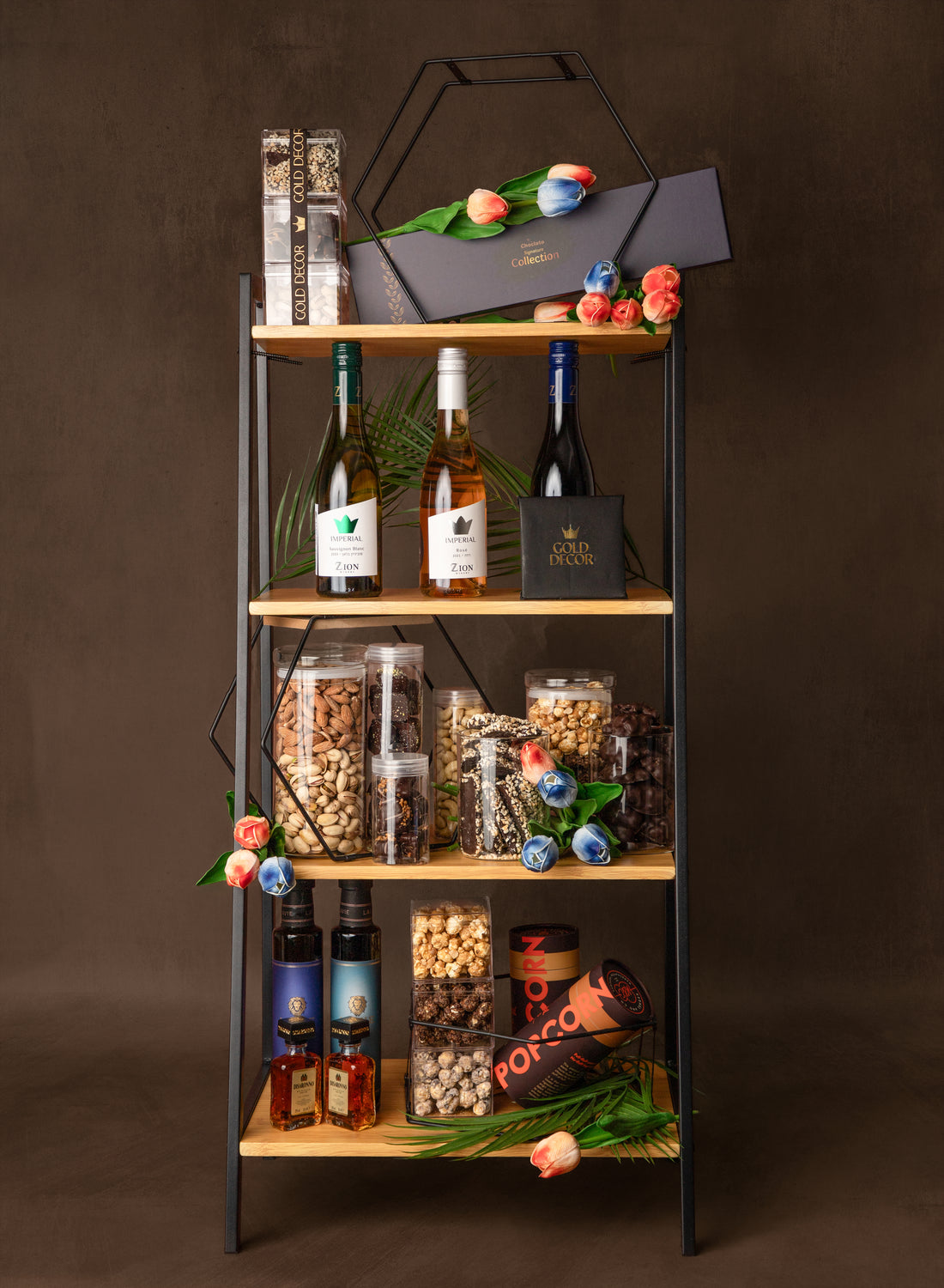 A unique wooden display with mini shelves, where tulips, chocolates and wines come together in...