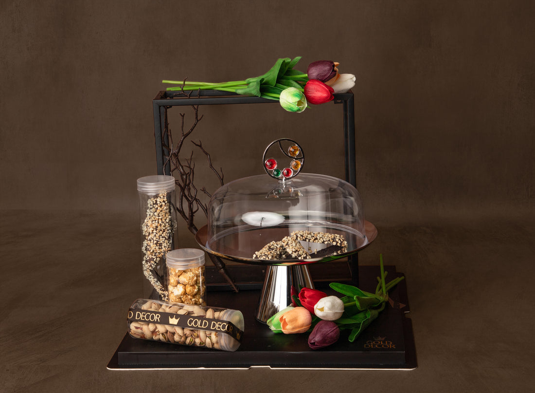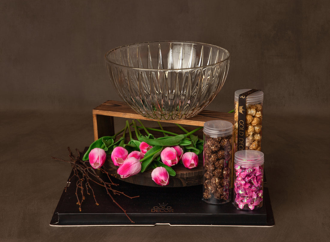 Featuring a metal bowl set on a colour crystal-accent stand, complemented by vibrant tulips and...