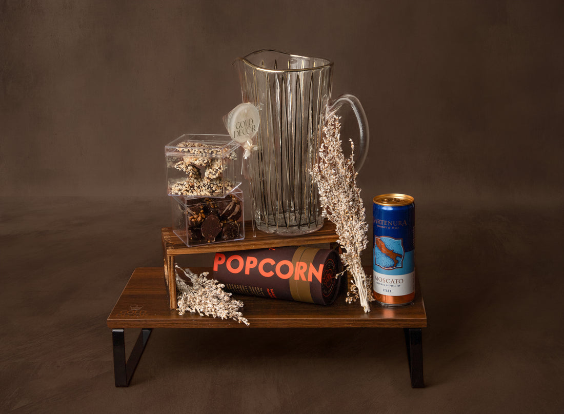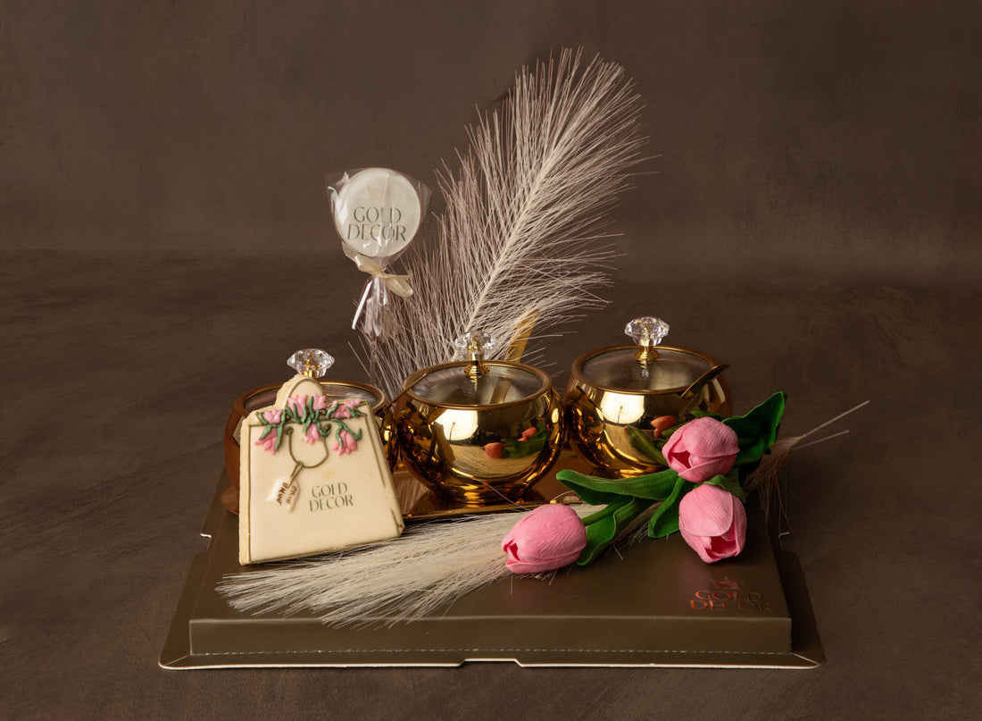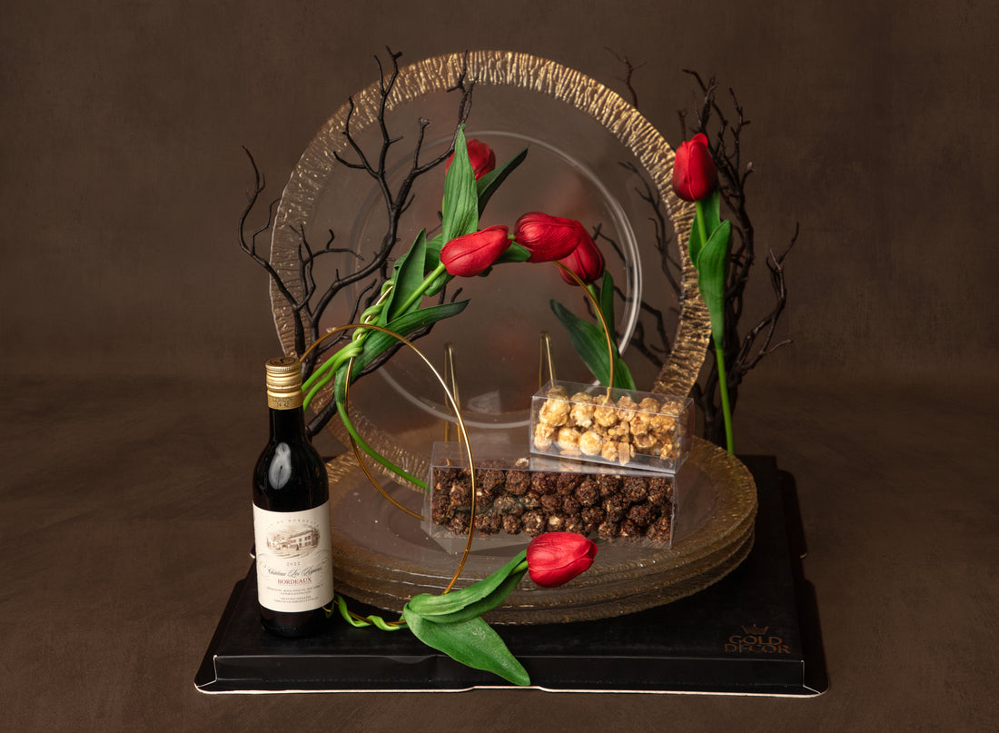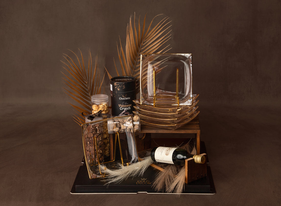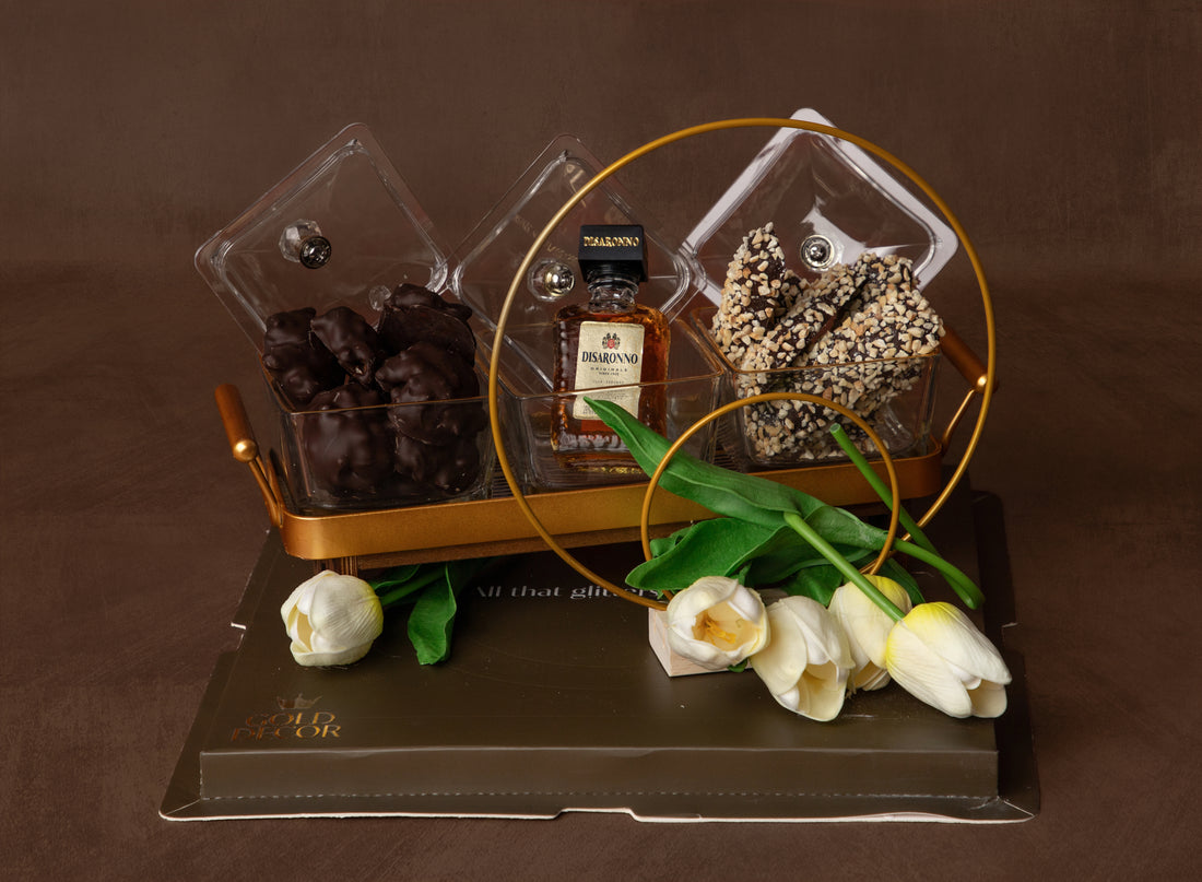 Distinct lucite and gold serving dish arranged with premium chocolates and miniature whisky bottle, complemented...