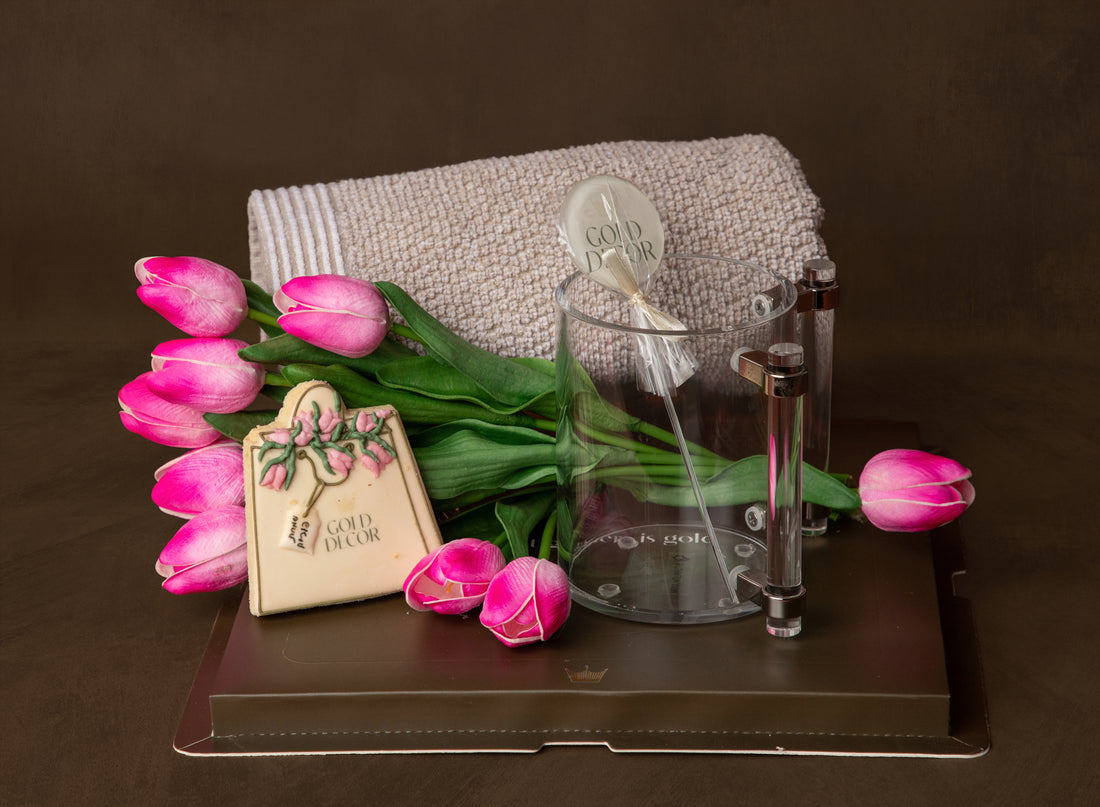 A lucite washing cup paired with a plush hand towel, complemented by hot pink tulips,...