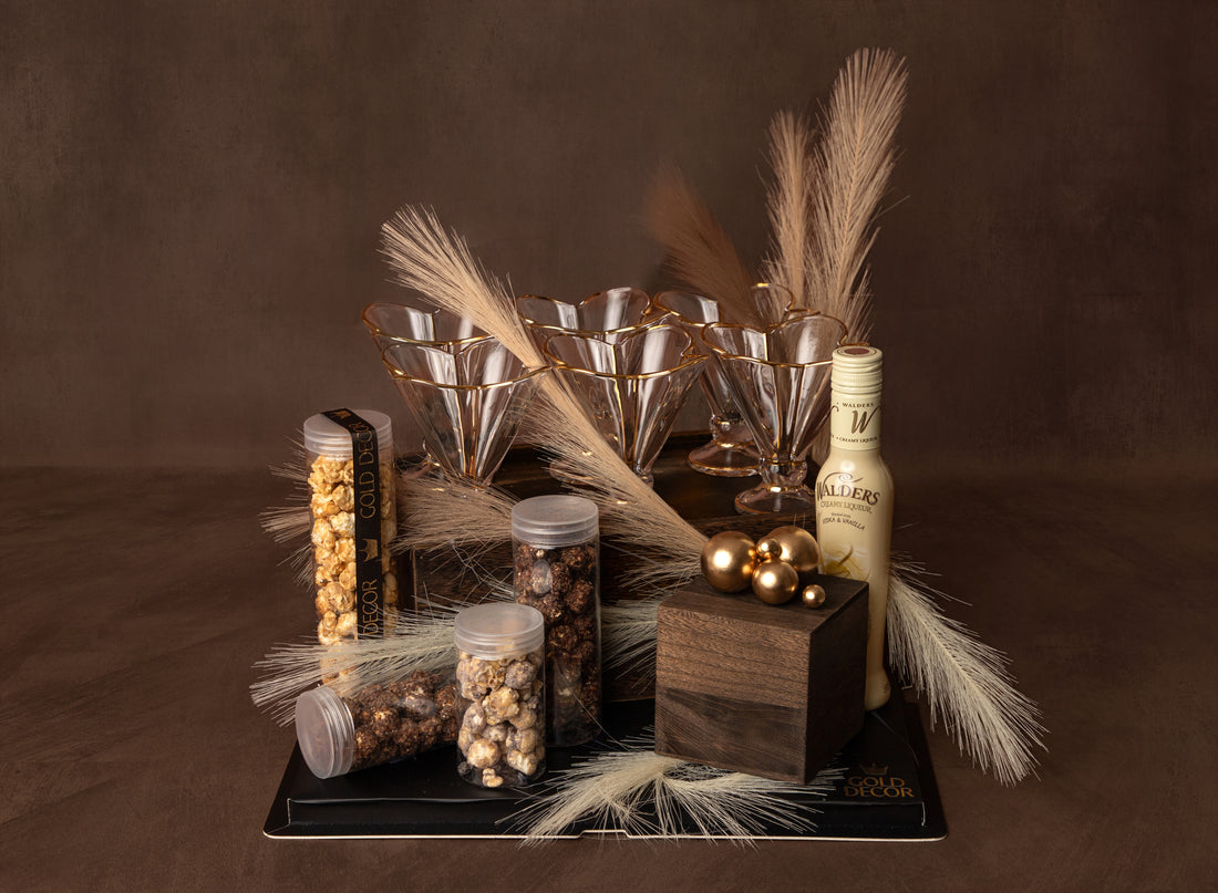 Six distinctive gold-rimmed dessert cups, arranged with filled tubes, soft feathers, whisky and gold accent...
