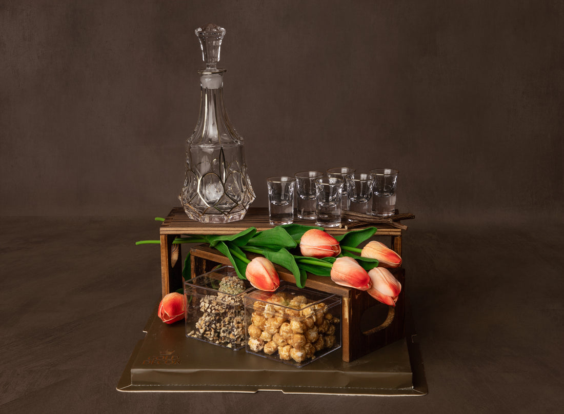 An ornate crystal decanter with six matching L’chaim cups, displayed on a wooden stand and...